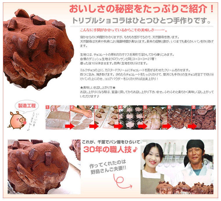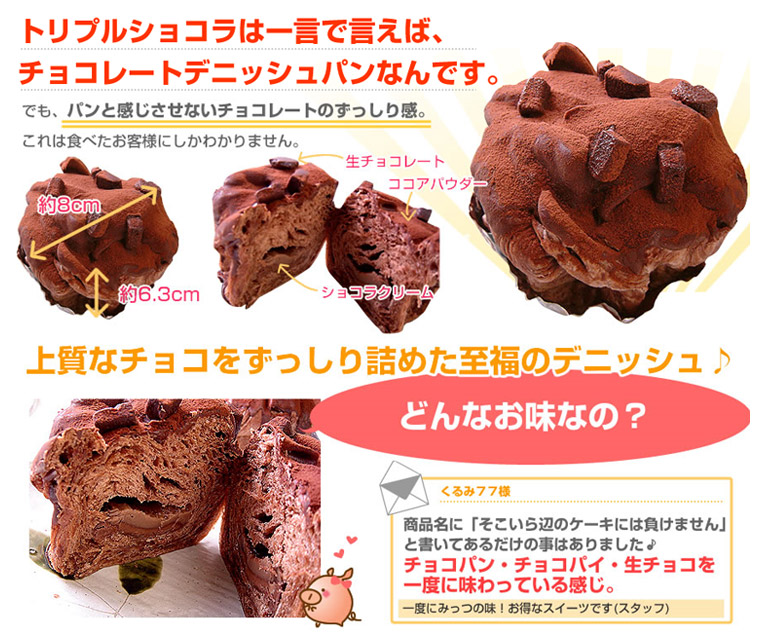 トリプルショコラは一言で言えば、チョコレートデニッシュパンなんです。でも、パンと感じさせないチョコレートのずっしり感。これは食べたお客様にしかわかりません。