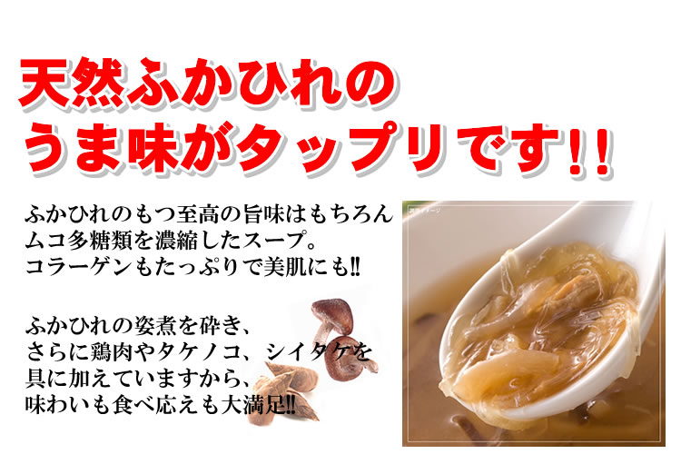 なんとふかひれは国産の天然ヒレのみ!よくあるチープなイミテーションじゃありませんよ。日本近海で水揚げされた天然の「吉切鮫」のフレッシュなヒレを使用しているのです。保存料、漂白剤などの添加物は一切未使用。ふかひれの持つ旨味をそのままお届けできるというワケ。ふかひれには言わずとしれた、コラーゲンやカルシウム、ムコ多糖類が豊富。お肌にも健康にも◎。さらにタケノコやシイタケなどをプラス。具の食感とふかひれのプリプリ感がもうたまりません!1袋にふかひれは12gずつ贅沢にイン。多少スープの中に溶け出してしまっているのはご容赦くださいませ。